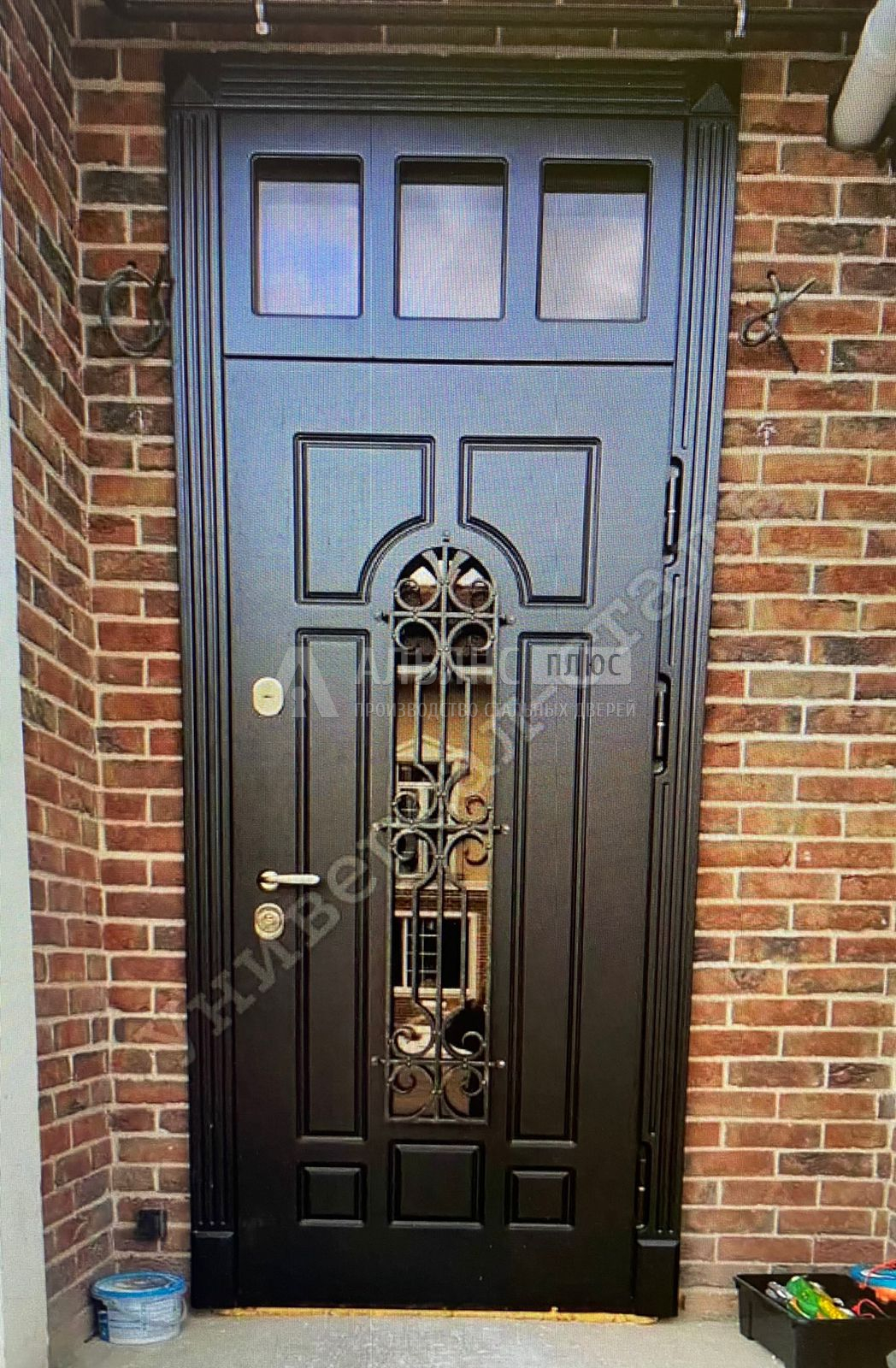 Для тех, кто хочет больше света в доме, оптимальна металлическая дверь со стеклом: стеклопакет защищён кованой решёткой, поэтому эстетика сочетается с безопасностью. Стеклянными вставками можно оформить верхнюю часть полотна, сделать узкую вертикальную полоску или использовать фигурный фрамуг — всё это вписывается в дизайн, если продумано ещё на этапе изготовления дверей.